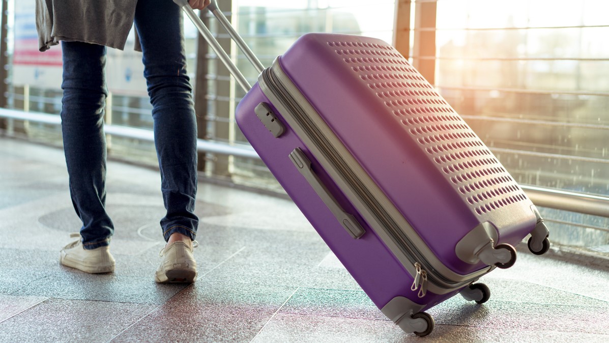 Young girl traveler walking with carrying hold suitcase luggage and passenger for tour travel booking ticket flight in airport international vacation time in holiday rest and relaxation.